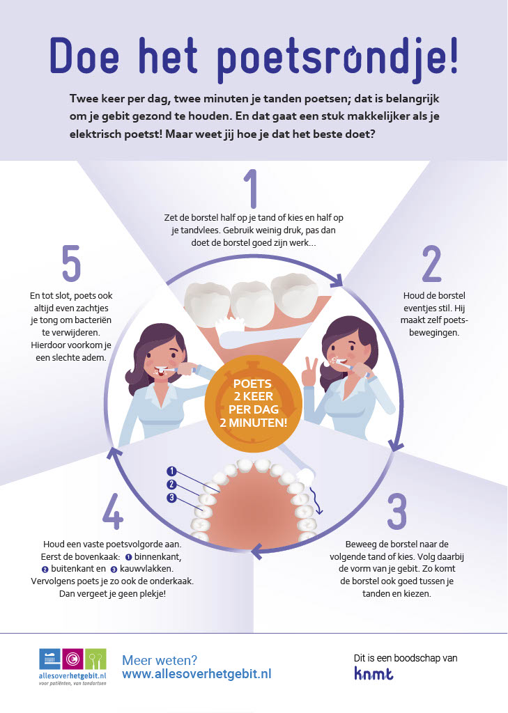 Uit klinisch onderzoek blijkt dat een elektrische tandenborstel plak beter verwijdert dan een hand-tandenborstel. Wij adviseren daarom om dagelijks twee keer minimaal twee minuten elektrisch te poetsen. Wil je weten hoe je dat het beste kunt doen? Leer jezelf het poetsrondje aan!